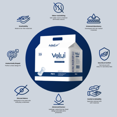 Valui Inserts are anatomically shaped aids designed to be used in conjunctions with a fixation accessory (e.g. net pants or underwear). To ensure pads are kept in place, Valui Inserts are available in two categories: Big sized (used with net pants) and Small Pads (sanitary like and used with normal underwear).