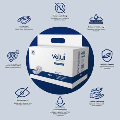 Valui Inserts are anatomically shaped aids designed to be used in conjunctions with a fixation accessory (e.g. net pants or underwear). To ensure pads are kept in place, Valui Inserts are available in two categories: Big sized (used with net pants) and Small Pads (sanitary like and used with normal underwear.